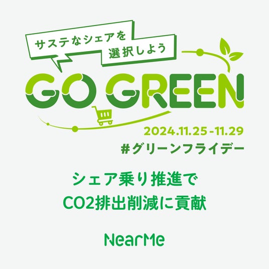 移動の課題に取り組むソーシャルデザインカンパニーの株式会社NearMe(本社:東京都中央区、代表取締役社長:高原幸一郎、以下:ニアミー)は、一般社団法人シェアリングエコノミー協会(代表理事:上田祐司、石山アンジュ、以下:シェアエコ協会)と、ニアミーを含めた同協会に加盟しているシェアリングサービス15社(16サービス)とともに「シェアエコグリーンフライデープロジェクト」に参画しています。