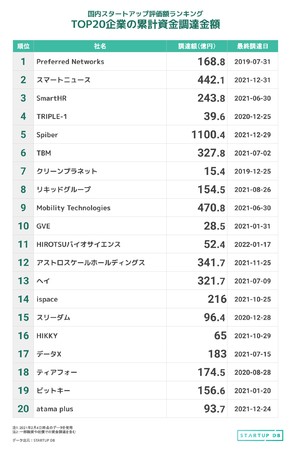 成長産業支援事業を推進するフォースタートアップス株式会社(本社:東京都港区、代表取締役社長:志水雄一郎 以下、フォースタートアップス)は、継続的に国内スタートアップ動向に関する調査を行い、当社サービスである「STARTUP DB (スタートアップデータベース)」に調査結果を公開しています。今回は、2022年2月4日時点での国内スタートアップ評価額ランキングを発表いたします。