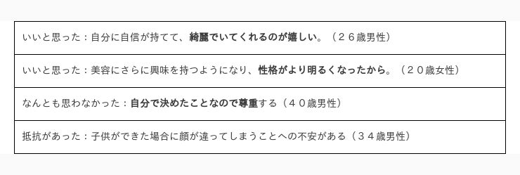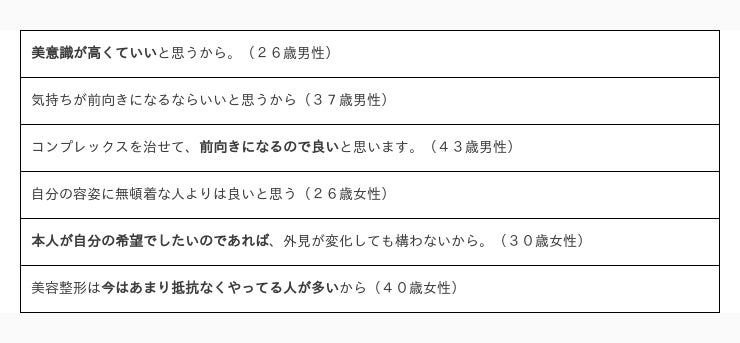 「いいと思う」と回答した人からは「気持ちが前向きになるならいい」「美意識が高くていい」など、行為自体を好意的に捉える意見に加え、「やっている人が多いから」と美容整形が身近なものになっていることが背景にある意見も聞かれました。