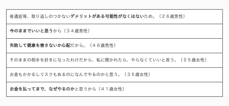 一方で、「抵抗がある・なんとも思わない」理由については、金銭面や後遺症などのリスクを危惧する意見がみられました。社会全体で美容整形が浸透してきているとはいえ否定的なコメントも散見され、多様な意見があることがわかりました。