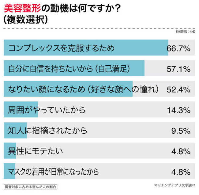 「コンプレックスを克服するため」(66.7%)を筆頭に、「自分に自信を持ちたいから(自己満足)」(57.1%)「なりたい顔になるため(好きな顔への憧れ)」(52.4%)など、自分自身に自信を持ち、前向きに行動できるようになるための動機が多いようです。