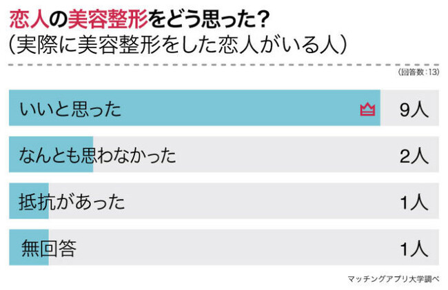 それでは、実際に恋人が美容整形をした13名の男女に、「恋人の美容整形についてどう思っているか?」たずねてみました。