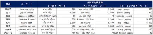 東南アジア圏においては、和牛、着物、日本酒、包丁といった製品に対する検索数が高い傾向があります。