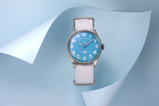 さらに、モスクワ第一時計工場のロゴもスカイブルーカラーとなっています。
