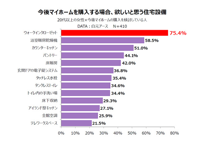 今回、さらなる市場の活性化を図るため独自に調査を行なった結果、ウォークインクローゼットは20~40代の所有率が高く、かつ今後マイホームの購入を検討している人にも人気の住宅設備であることが分かりました(下図参照)。
