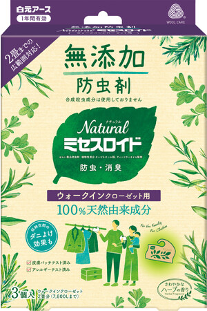 白元アース株式会社(本社:東京都足立区、社長:吉村一人)は、100%天然由来成分でできた衣類用防虫剤「Naturalミセスロイド」より、広い空間に対応した『ウォークインクローゼット用3個入』を8月1日より新発売いたします。