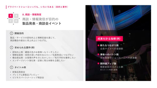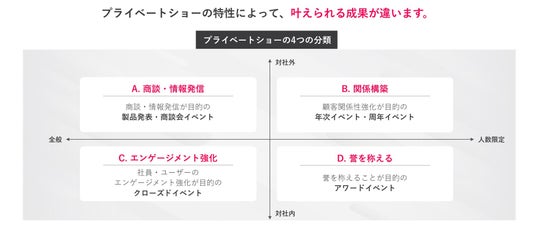 - プライベートショーは、「商談・情報発信」「関係構築」「エンゲージメント強化」「誉を称える」という4つの目的別に分類できる。また、それぞれに適した成果指標がある。
