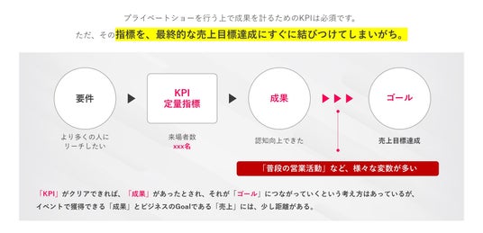 一方で、マーケティング施策の費用対効果を重要視するために、プライベートショーにおいても、売上直結型の目標設定が求められてしまうことがしばしば見受けられます。しかし、実際の売上には「普段の営業活動」といった様々な変数が影響するため、施策単位ではもう一段階前のKPIを設ける必要があるのです。