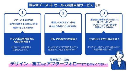 本サービスは、展示会で獲得した名刺の活用に課題を抱えている企業を対象としています。展示会終了後の商談機会の喪失を防ぎ、受注獲得をサポートするために、簡単にブース施工が行えるパッケージと、獲得名刺に対するTELアポフォロー活動をセットで提供いたします。