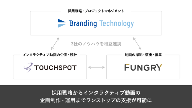 開発3社のノウハウを相互連携させることで、採用戦略からインタラクティブ動画の企画制作・運用までワンストップの支援が可能に。当社の人事戦略室長、内山によるプロジェクト主導のもと、インタラクティブ動画の企画設計をタッチスポット株式会社、動画の撮影・演出・編集を株式会社ファングリーが担当し、企業の採用課題解決につながるサービス提供を行います。