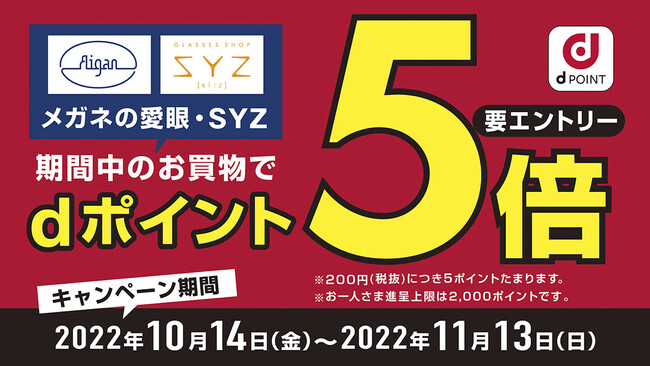 よりお客様のお買い物が楽しく、お得になるように全国のメガネの愛眼、アイウェアショップSYZ(シーズ)にてdポイントが通常の5倍たまるキャンペーンを開催いたします。