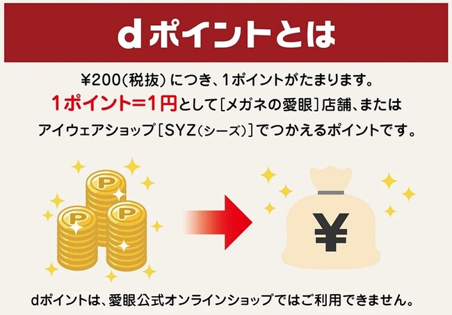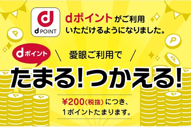 2022年6月現在、約9,040万人の会員数を有する共通ポイントサービス「dポイント」を導入することで、愛眼の商品・サービスの魅力を高め、これまで以上に多くのお客さまの楽しいメガネ選びをご提供いたします。