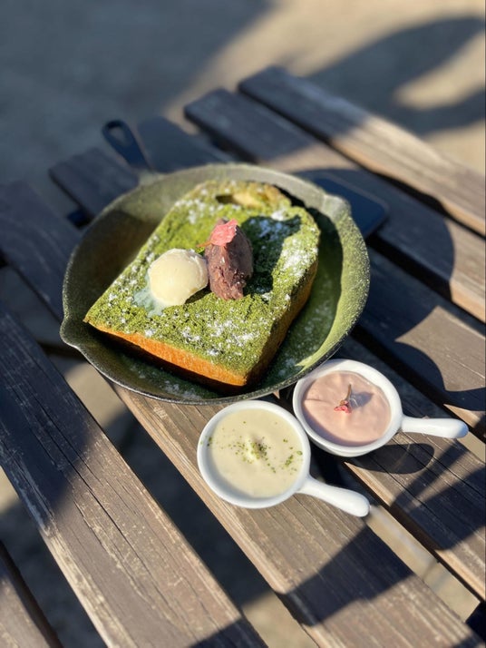 ほんのり桜香る抹茶のフレンチトーストにバニラアイスとあんこ、別添えの桜クリーム、豆乳クリームと共に1皿で何度も味わいが変化するSWEETSです。