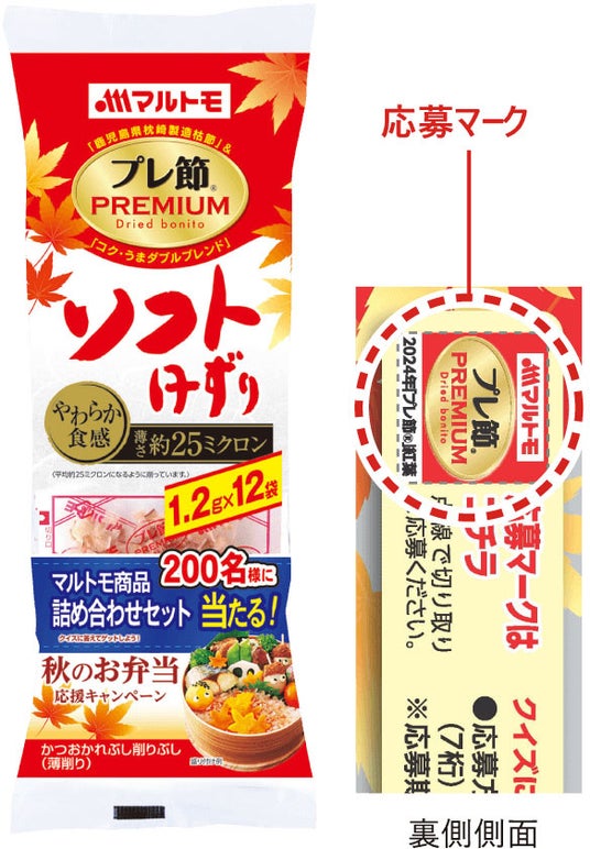 本キャンペーンは、2024年8月中旬から数量限定発売予定の「プレ節(R)」紅葉デザイン商品を対象とし、簡単なクイズに答え、必要事項を記入の上、パッケージ側面に印刷されている応募マークをハガキに貼り付け応募すると忙しい朝のお弁当作りに役立つマルトモ商品詰め合わせセットが抽選で200名様に当たります。紅葉のように美しく彩りを添える「プレ節(R)」で秋のお弁当をよりおいしく、華やかに演出しませんか?