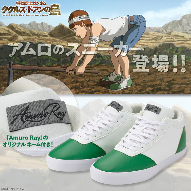 本商品は、『機動戦士ガンダム ククルス・ドアンの島』にてアムロが島内で着用していたスニーカーを再現したアイテムです。「Amuro Ray」をデザインしたオリジナルネームがシュータンの部分につきます。
