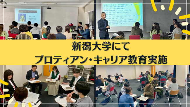 一般社団法人プロティアン・キャリア協会(東京都新宿区、代表理事:田中研之輔・有山徹、以下、「当協会」)の教育ラボに所属する認定メンバー及び新潟県プロティアン・キャリア普及協会の活動目的に賛同する新潟に縁のある社会人が、新潟大学の「学生がデザインする働き方の未来」(准教授 樋口健 先生)の授業プログラムの一環としてプロティアン・キャリア授業を提供してきました。小中高校への出前授業を実施してきた当協会メンバーによるキャリア教育プログラムです。今回は初めての大学での実施となりました。プロティアン・キャリア理論の授業後、働く大人と学生でチームになり、自由な対話を通して働くことの楽しさ、意義を確認しながら学ぶ時間となりました。