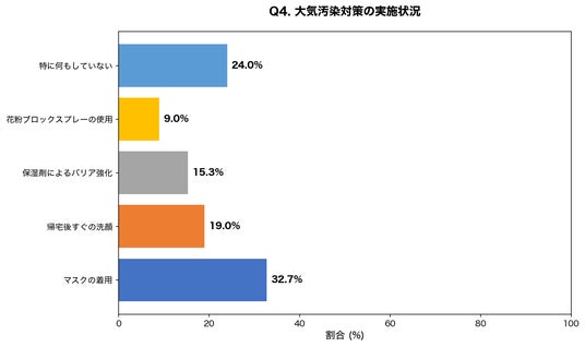 マスク着用が最も多い対策でしたが、肌に直接的に効果のある「帰宅後の洗顔」や「保湿によるバリア強化」を実践している人は少数派でした。また、24.0%の人は何も対策をしておらず、適切なスキンケア方法の啓発が必要です。