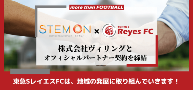 東急SレイエスFC様はビジョンとして「東急沿線コミュニティの中心的機能として、人と街の成長に貢献する」を掲げており、ヴィリングはSTEAM教育を通じて、子どもたちの成長や地域の発展に東急SレイエスFCと連携して貢献して参ります。