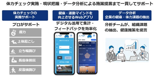 チェック結果は、当社が企業向けに提供している体力チェックアプリ「ALPHA for Biz」に入力し、