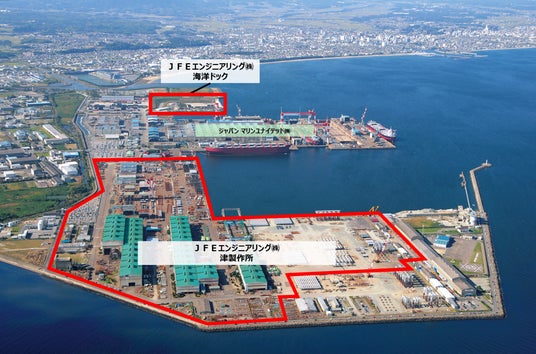 当社は本補助金を活用し、津製作所(三重県津市)[※2]を浮体式洋上風力発電基礎製造の拠点として設備投資を行い、浮体式基礎のモジュール製造から完成品の組立までを一貫して行う体制を構築することで、2030年までに浮体式基礎を年間24基以上量産する計画としています。