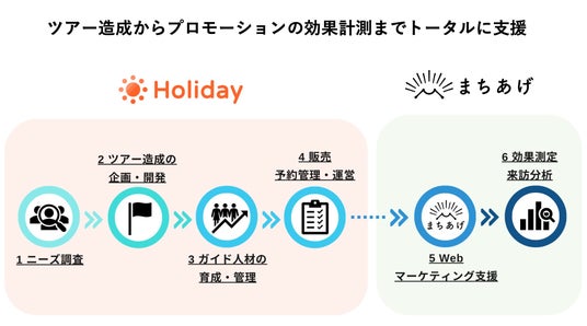 地方自治体向けマーケティングプロダクト「まちあげ」と、ホリデーのサービスが連携することで、国内外からの観光客誘致のためのツアー造成開発・販売(関連会社のホリデートラベル株式会社が提供)及び、来訪計測などの効果計測を含めたプロモーション支援サービスをワンストップで提供することが可能となります。