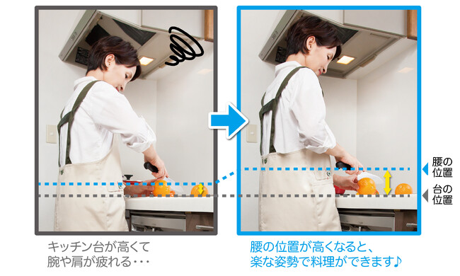 しっかり厚底で腰の位置が高くなりラクな姿勢で料理ができたり、届かなかった棚に手が届き家事が捗ります。