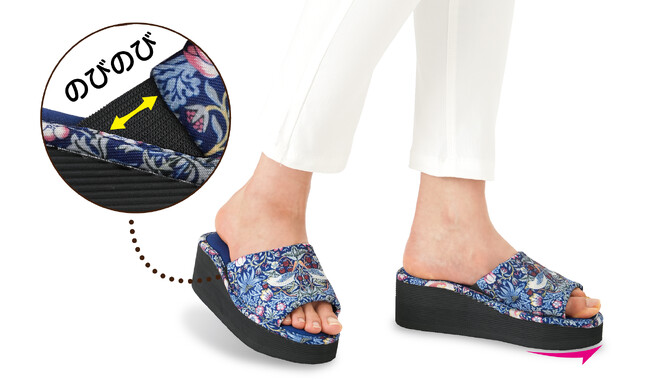 厚底なのにつま先上がりでつまずきを防止し、安心して歩けます。