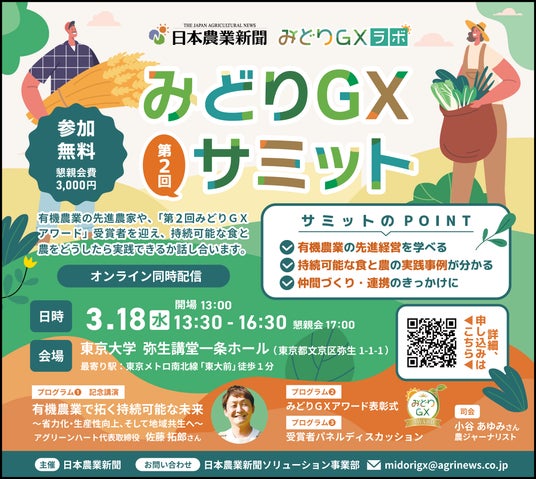株式会社日本農業新聞(東京都台東区、代表取締役社長:田宮和史郎)は、持続可能な食と農の実現を目指すコンソーシアム「みどりGXラボ」の会員交流イベント「第2回みどりGXサミット」を、2026年3月18日(水)に東京都文京区の東京大学・弥生講堂で開きます。気候変動への対応や環境に配慮した農業に関心のある農家やJA、消費者、自治体、企業、研究者など多様な主体が全国から集結。有機農業を大規模・低コストに実践するアグリーンハート(青森県黒石市)の佐藤拓郎代表や、先進事例表彰「第2回みどりGXアワード」の受賞者を迎え、持続可能な食と農を行動に移す方法を探ります。