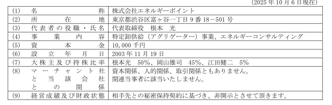 2025 年10 月7 日付で、第三者割当の方法により、マーチャント社がエネルギーポイント社の普通株式120 株(第三者割当後の発行済株式総数に対する所有割合20.0%)を取得します。取得価額は3 百万円(1 株当たり25,000 円)になります。