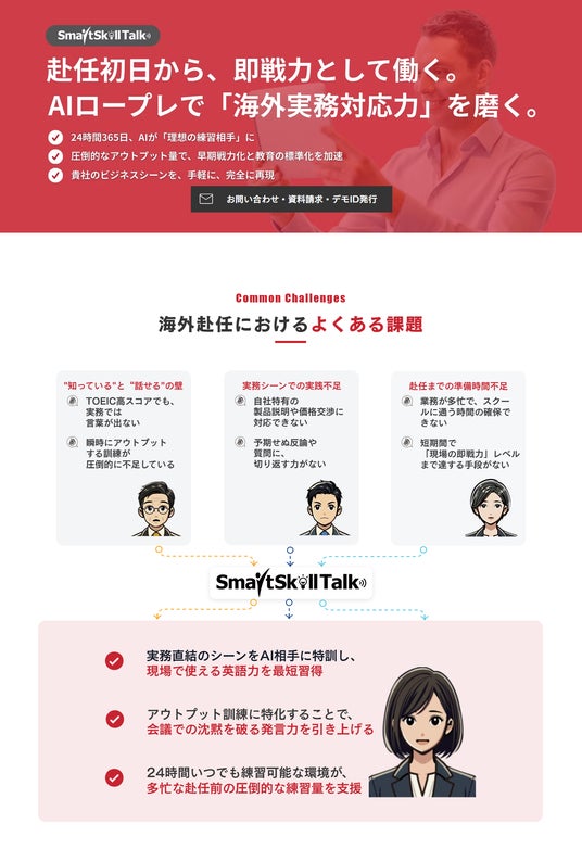 今回のリニューアルでは、多様化するビジネス現場の課題に即した4つのソリューション(営業・マネジメント・外国人材・海外赴任)ページを新設。併せて、AIロープレを活用し、組織の対話力を劇的に変えるためのノウハウをまとめた「AIロープレ活用 パーフェクトガイド」の無料配布を開始したことをお知らせいたします。
