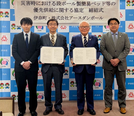 埼玉県北足立郡伊奈町と株式会社アースダンボールは「災害等が発生し、または発生する恐れがある場合において、段ボール製簡易ベッド等の優先供給の協力に関して、町民の避難生活の早期安定を図るための協定」を締結