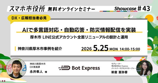 株式会社Bot Express(本社:東京都港区、代表取締役:中嶋一樹、以下 Bot Express)は、官公庁・地方自治体のDX事例を共有する無料オンラインセミナー「Bot Express Showcase」を定期的に開催しています。このたび、5月25日(月)の開催が決定しましたのでお知らせいたします。今回のテーマは、「AIで多言語対応・自動応答・防災情報配信を実装。厚木市LINE公式アカウント全面リニューアルの設計と運用」です。