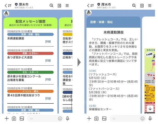 神奈川県厚木市は、2020年8月にLINE公式アカウントを開設し、2023年12月にはLINE公式アカウントの拡張サービス「GovTech Express」を連携しました。連携後は、イベントや講座の予約、公共施設検索、マイタイムラインの作成、パブリックコメントの募集など、幅広い分野で活用が進んでいます。