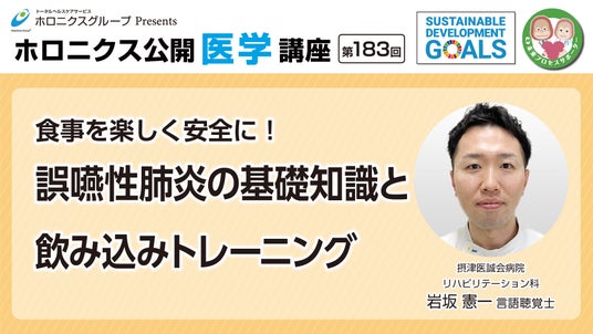 医療法人医誠会(本社:大阪府大阪市、代表者:谷 幸治)は、第183回ホロニクス公開医学講座『食事を楽しく安全に!誤嚥性肺炎の基礎知識と飲み込みトレーニング』を2024年5月30日(木)にYouTubeにて配信しました。この動画は、誤嚥性肺炎についての基礎知識や予防策、家庭でできる飲み込みトレーニングを解説しています。リハビリに興味のある方にとって、非常に有益な情報が詰まった内容となっています。