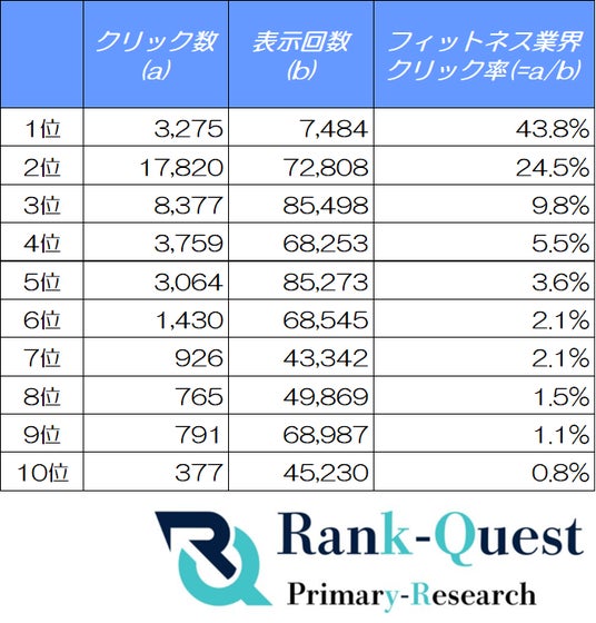 【SEO対策】で検索結果1位を獲得した(注1)ランクエスト(https://rank-quest.jp/column/column/how-to-seo/ )は、2025年5月にフィットネス業界のクライアントサイトを対象とした「検索順位ごとのクリック率(CTR)」の調査を実施しました。