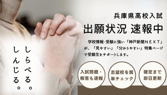 株式会社神戸新聞社(本社:兵庫県神戸市)は、2月から出願が本格化する高校入試に合わせて、兵庫県内のすべての公立高校と私立高校の出願状況を、ニュースサイト「神戸新聞NEXT」内の特集ページで速報します。特集ページでは、各校の出願倍率の変化や倍率上位校をボタン一つで切り替えて表示ができます。見やすさと、わかりやすさで、高校入試を全力サポートします!!