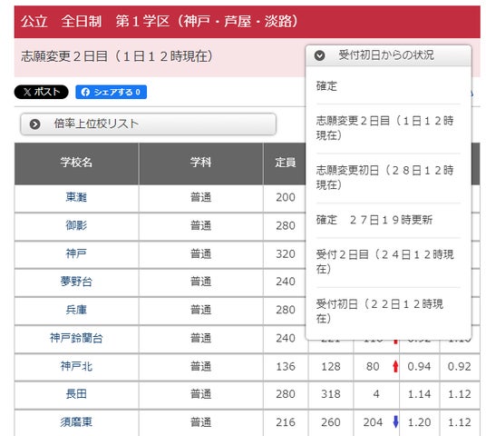 初日、2日目、志願変更…と、日々変化する出願倍率。神戸新聞NEXTなら、ボタンで切り替えて各学校の倍率の変化を簡単に確認することができます!