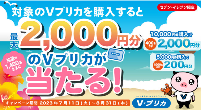 セブン‐イレブン店内に設置されているマルチコピー機より対象のVプリカを購入すると、抽選で1,400名さまに最大2,000円分のVプリカが当たる!