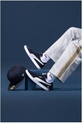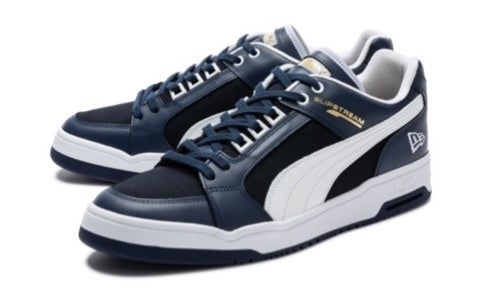 「PUMA x New Era(R)」コレクションは、プーマの最高峰のMIJ(MADE IN JAPAN)シリーズから、「PUMA SUEDE(プーマ スウェード)」と「SLIPSTREAM(スリップストリーム)」の2モデルが登場します。どちらもニューエラが誇るベースボールキャップのワールドスタンダード「59FIFTY(R)(フィフティーナインフィフティー)」をモチーフにデザインされています。オーセンティックな雰囲気を醸し出すネイビーxホワイトのカラーリングに、59FIFTY(R)のバイザーステッカーを連想させるゴールドの文字が挿し色で取り入れられています。59FIFTY(R)と連動するように左足のみニューエラのフラッグロゴを刺繍したアシンメトリーなルックスが特徴です。