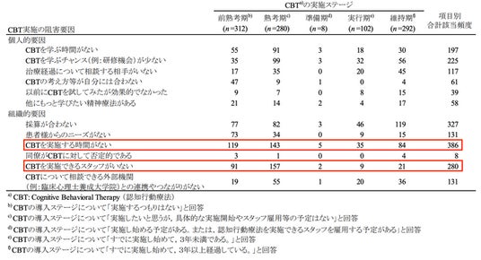 出典:日本の精神科診療所における認知行動療法の提供に関する実態調査「認知行動療法実施阻害要因の該当頻度の違い」