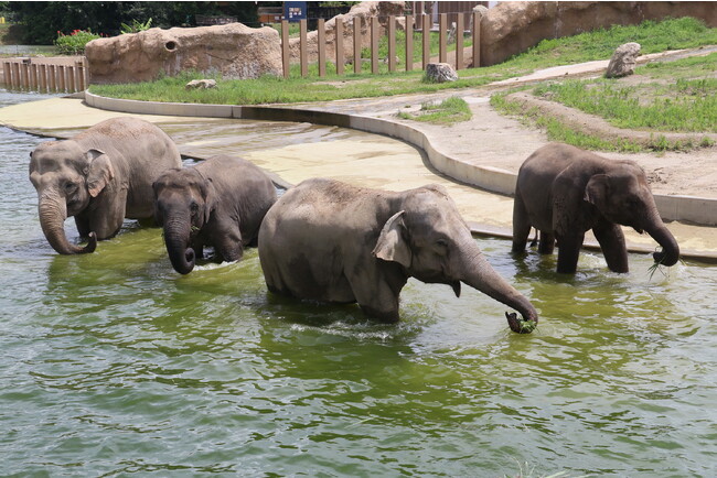 のんほいパークでは、ゾウの習性に適した「群れ飼育」が可能な国内最大級の広さを誇る放飼場とプールを備え、アジアゾウ6頭を飼育しています。