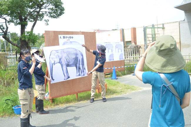 ゾウが好きで、のんほいパークのホームページを見て愛知県一宮市から家族と来た小学5年生の男の子は「ゾウの健康評価のやり方が『こうやってやるんだ』とよくわかりました」と話し、他の動物園にはない授業に喜んでいました。