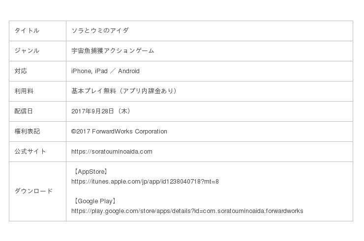 株式会社フォワードワークス(以下、FW)は、スマートフォン向け宇宙魚捕獲アクションゲーム『ソラとウミのアイダ』において、2018年5月7日(月)より新イベント「竜宮のツカイを捕獲せよ!」を開催いたします。このイベントでは、通常のノーマルイケス挑戦中に稀に遭遇するレア魚として「竜宮のツカイ」が出現し、捕獲するとイベントポイントで豪華報酬が手に入ります。合わせてイベント期間限定の特別ログインボーナスを実施するほか、イベント攻略に役立つ新守護神も登場します。