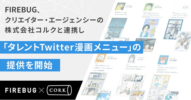 株式会社FIREBUG(本社:東京都渋谷区、代表取締役 CEO:佐藤詳悟、代表取締役 CIO/CFO:宮崎聡、以下当社)は、株式会社コルク(東京都渋谷区、代表取締役CEO:佐渡島庸平、以下コルク)と共同で新しいデジタルプロモーションサービス「タレントTwitter漫画メニュー」を開始したことをお知らせいたします。
