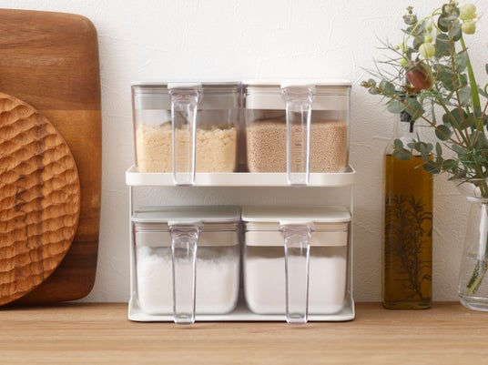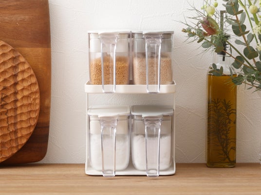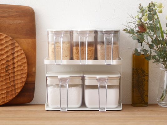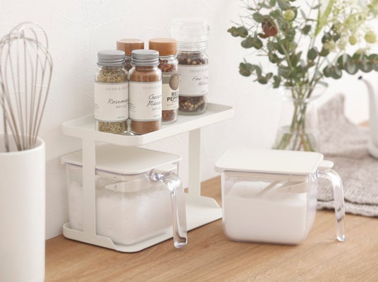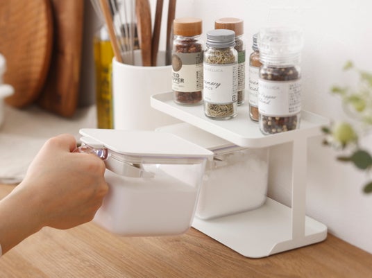 「調味料ラック」は1段につき調味料ポットが2個収納できる専用ラックです。底面には滑り止めが付いていて、出し入れの際に安定します。スパイス等の収納にも使用できます。