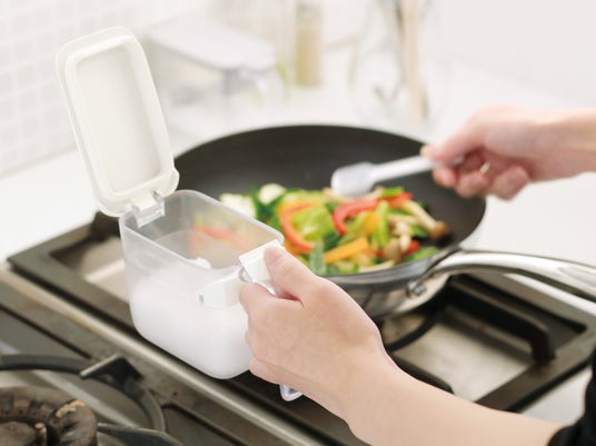 調味料ポットは密閉性とワンタッチオープンなどの操作性を兼ね揃えた調味料入れです。シリコーンゴムのパッキンで湿気を防ぎ、調味料が固まりにくく、手元のボタンを押すとしっかり閉まっていてもワンタッチで開きます。既存の調味料入れは、持ち手側にフタが開くのに対し、 調味料ポットはフタが奥に開くため、調理中もさっとすくえます。