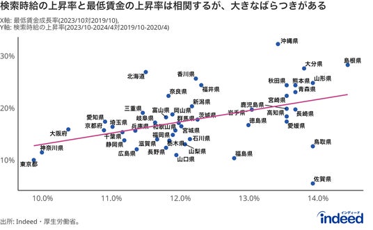 一方で、2019年からの検索時給の上昇率でみると、高い順に沖縄県(34.2%)、島根県(33.1%)、北海道(32.2%)、宮崎県(30.8%)、香川県・熊本県(ともに29.8%)となり、地方圏が上位となっています。これは、最低賃金の上昇率との相関がみられます。