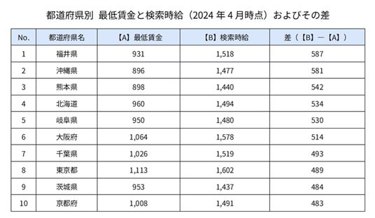 検索時給額は2024年4月1日の金額で、最低賃金との差額が大きい順に都道府県をソート