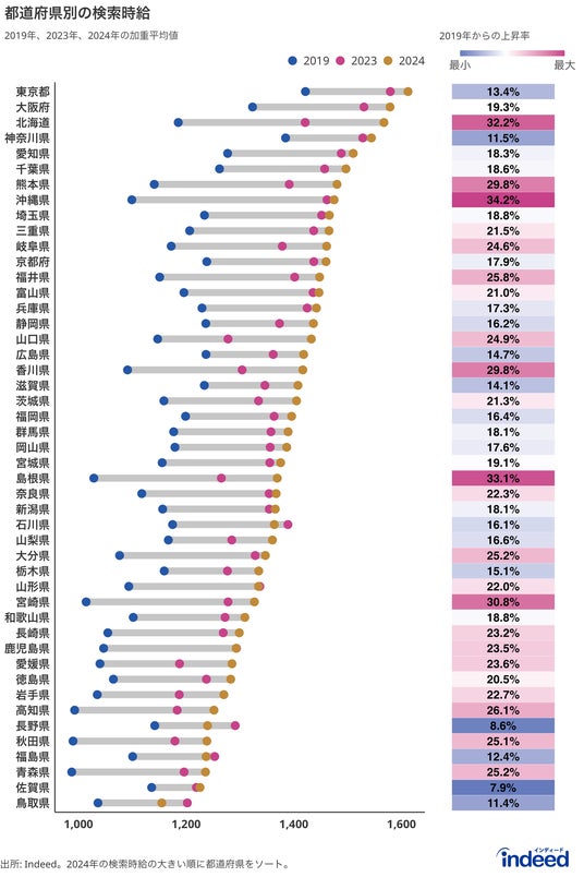 世界No.1求人サイト* 「Indeed (インディード)」の日本法人であるIndeed Japan株式会社(本社:東京都港区、代表取締役:大八木 紘之、https://jp.indeed.com 以下Indeed)は、仕事を探す際に求職者が検索する時給(検索時給)の動向について、2024年4月時点でのデータを分析し公開いたします。