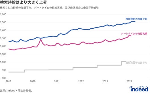 Indeedにおける検索時給の加重平均値、パートタイム労働者の時給実績(厚生労働省「毎月勤労統計調査」より)、最低賃金の全国平均(厚生労働省)の推移。期間は2019年1月から2024年4月まで。ただしパートタイム労働者の時給実績については最新月である2024年3月まで。